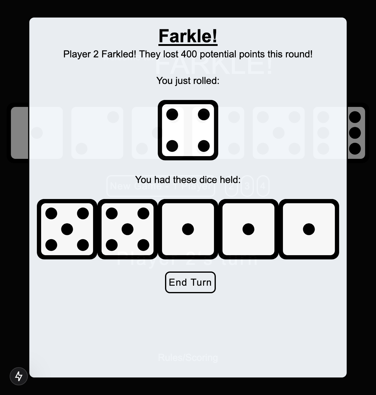 Well that was tough to write. Anyway...let's get back to the topic at hand I suppose. Farkle, I did it. Mostly. I do still have to work on the styling of the app a bit more. Maybe add a light mode or some way to customize the color scheme, maybe I'll even do it so it can be different per player. I also want to add the ability to play it online against other people so I will probably also have to have a sign in feature or something like that, but that will come later when I start actually working with databases and start dipping my toe into real backend stuff. Okay, so the core part of the app is done, as in the scoring and the many MANY conditionals that come with it. I also want to play a few more test rounds here and there, but yeah for the moment it is ready to launch.